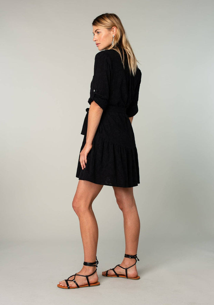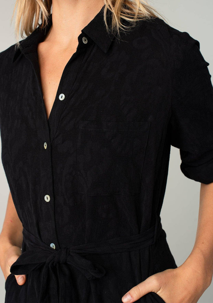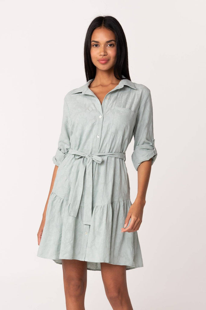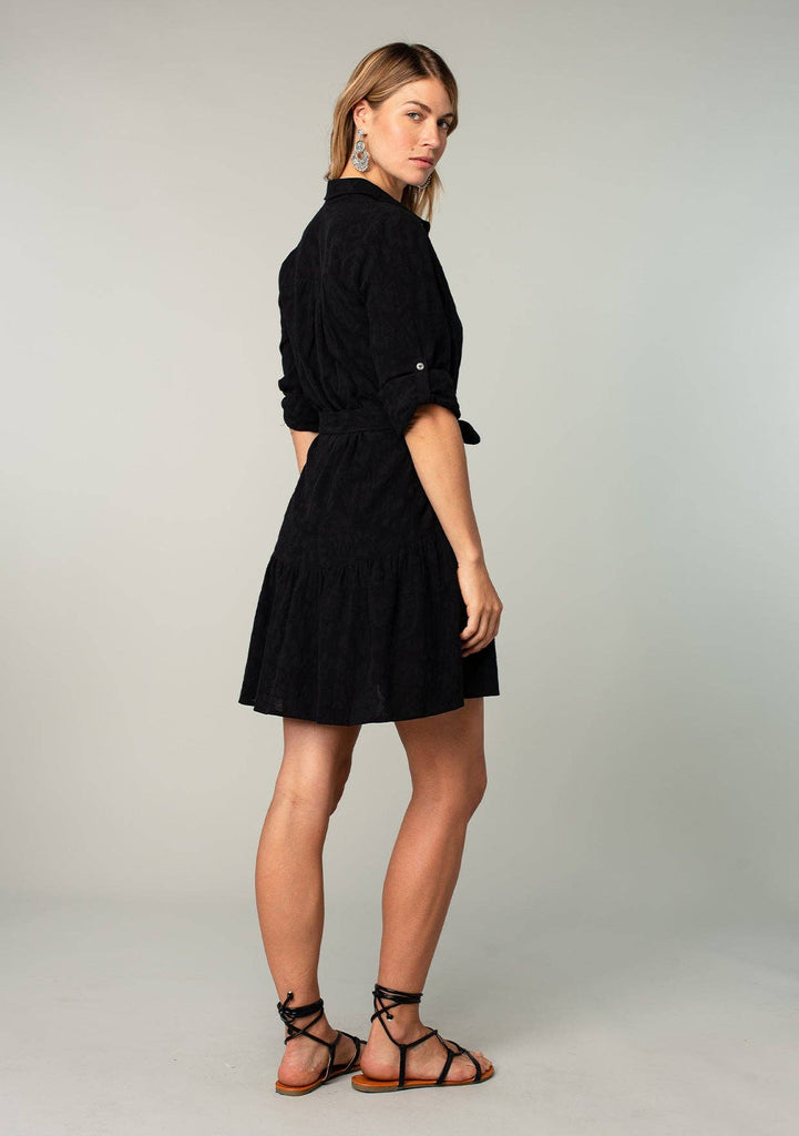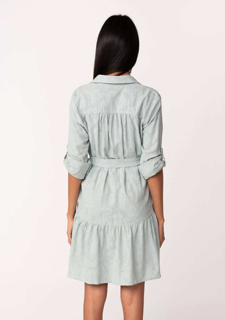 Unleash your flirty side with our Long Sleeve Collared Drop Waist Mini Dress. This Jacquard floral dress exudes playful femininity with its collared neckline and roll tab sleeves. The drop waistline flatters your figure while functional details like a button front, adjustable fabric belt, and pockets add convenience. Detachable lining for added versatility.