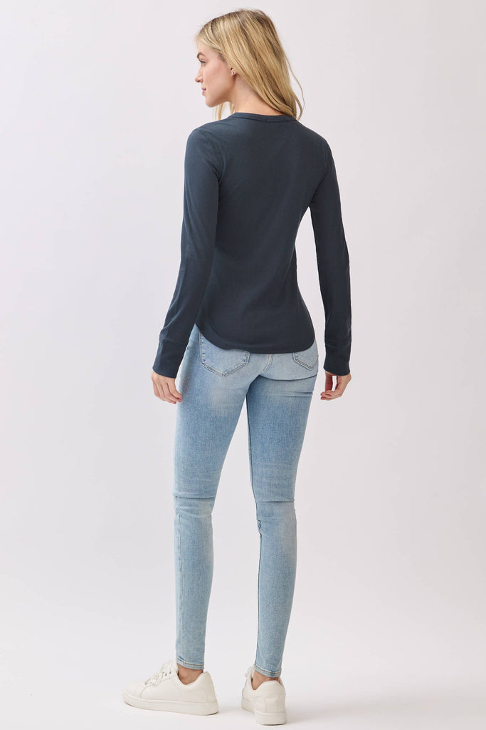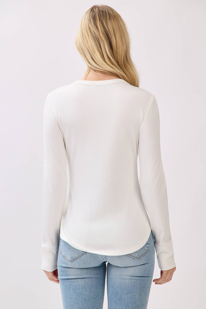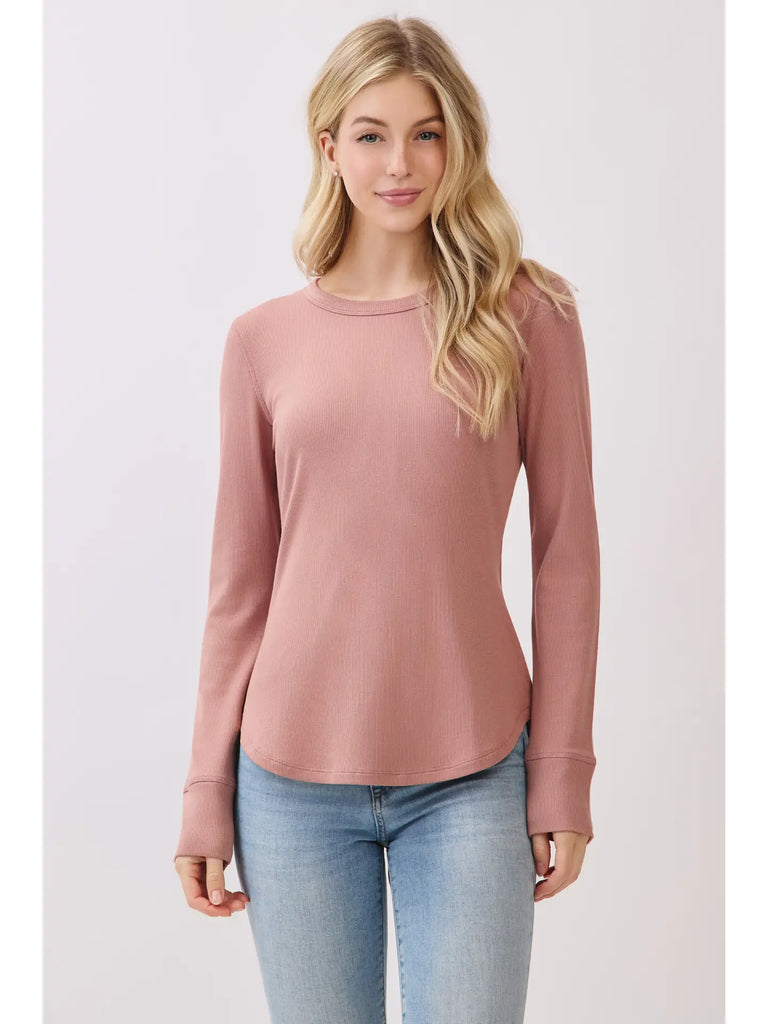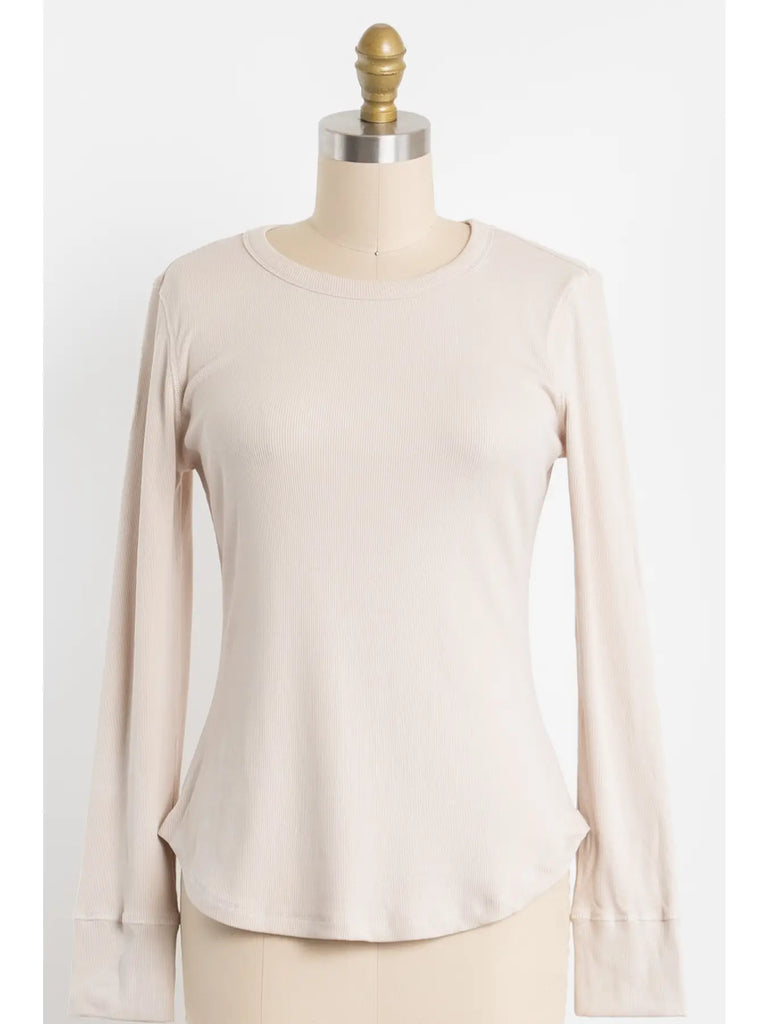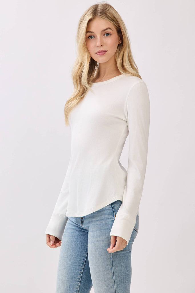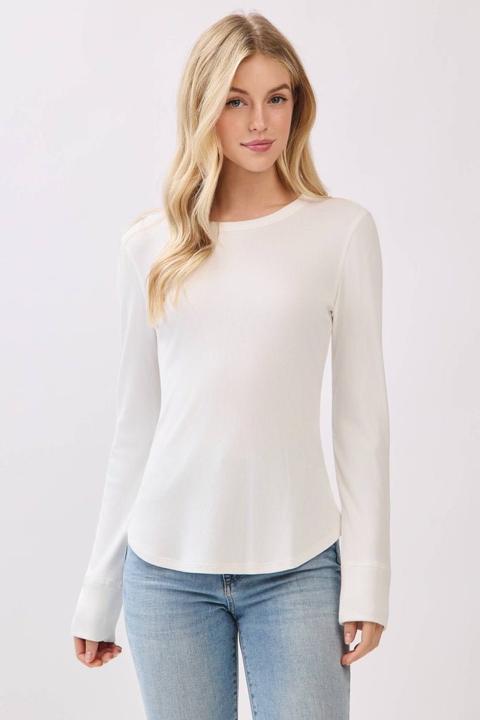 A timeless staple with a modern fit. This ribbed crew neck long sleeve is designed with a flattering fitted silhouette and a rounded hem that pairs effortlessly with your favorite denim, skirts, or layered looks. Made from a soft cotton-spandex blend, it offers breathable comfort with just the right amount of stretch to move with you. Perfect for layering or wearing on its own, this top is an essential piece for every season.